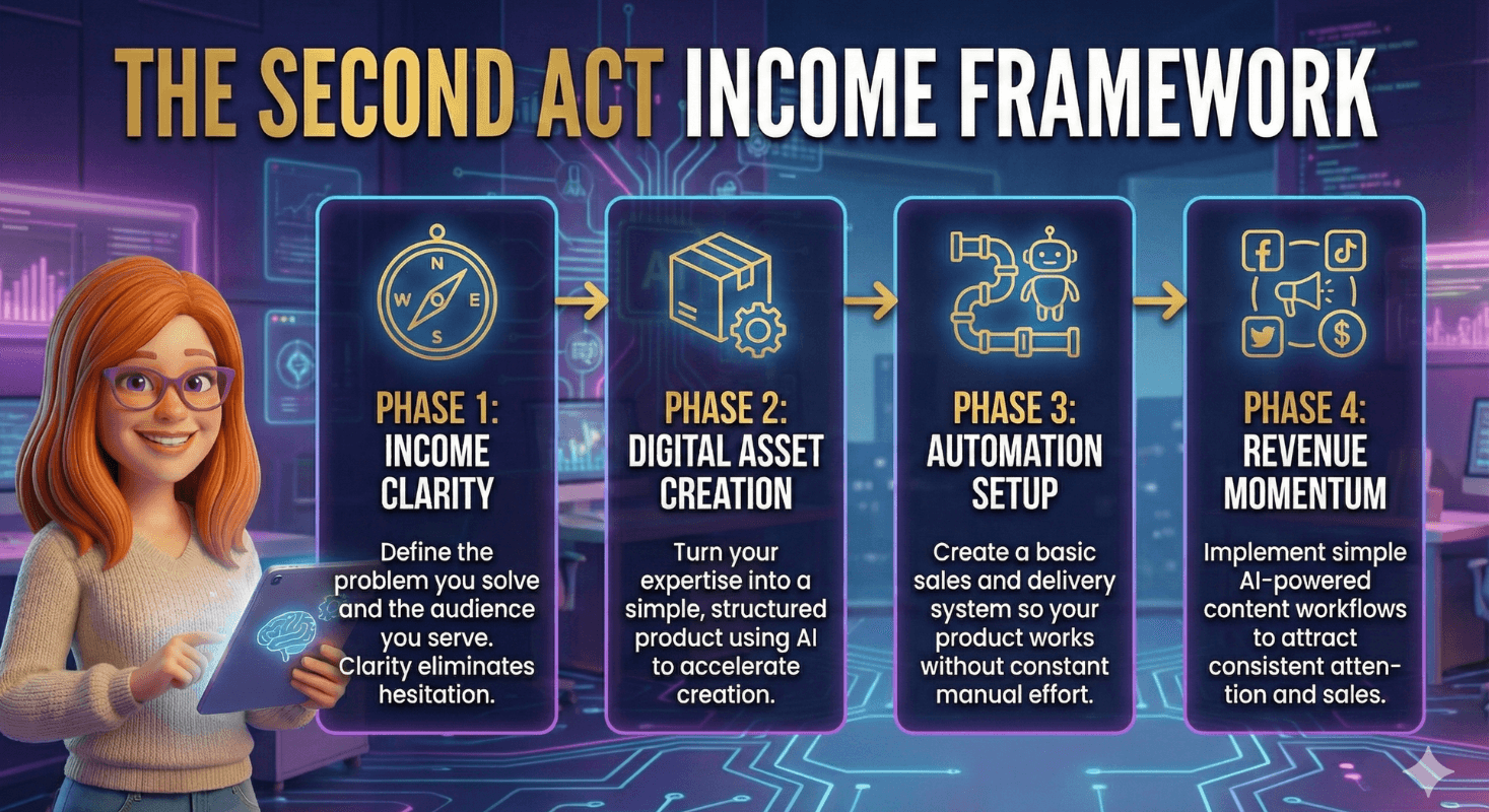 The Second Act Income System shows you exactly how to turn decades of experience into a simple, automated digital income stream using AI. Even if you are not technical.